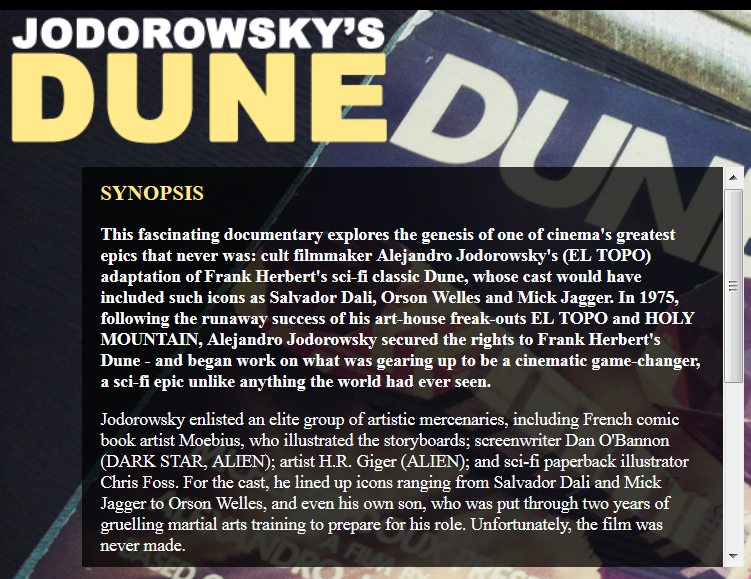 The most amazing movie that was never made. The Players were not only the best technicians they were Spiritual Warriors committed to giving the movie it's all, some even were so committed to the project that they indeed risked it all. The storyboards of this nineteen eighties movie have reproduced itself and appear on all our favorite movies, alien, star wars, Indiana Jones.