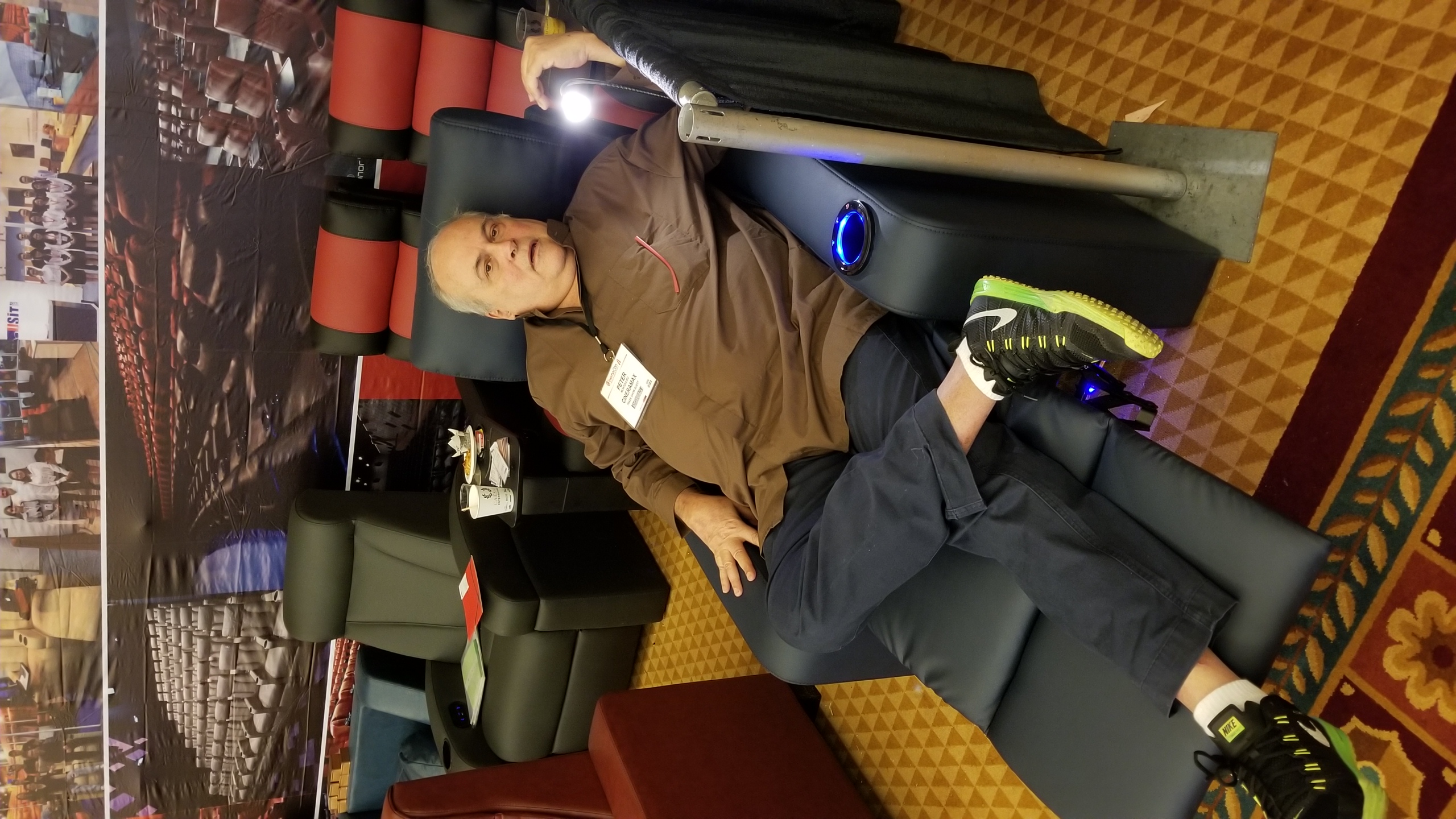Here you can almost see the 3 inch travel of the headrest adjustment that tilts forward to hold you head in place when fully reclined. You would expect this in a 7,000 Cineak, not this bargain basement beauty.