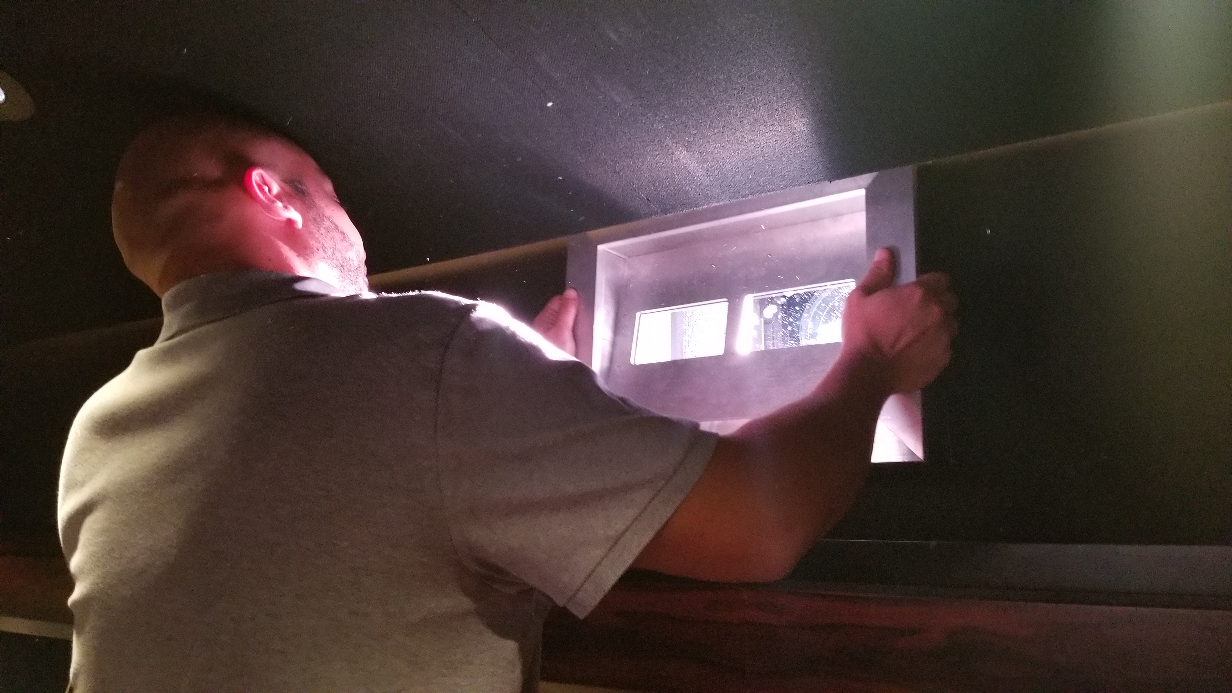 The purpose of the dual windows is to rotate the porthole to compare filters. I prefer the 1.5 stop reduction Schneider, the client predictably appears to be liking the 3 stop arri. In this particular installation we were able to fit 2 side by side filters and then flip the porthole to lign up with the projection axis.