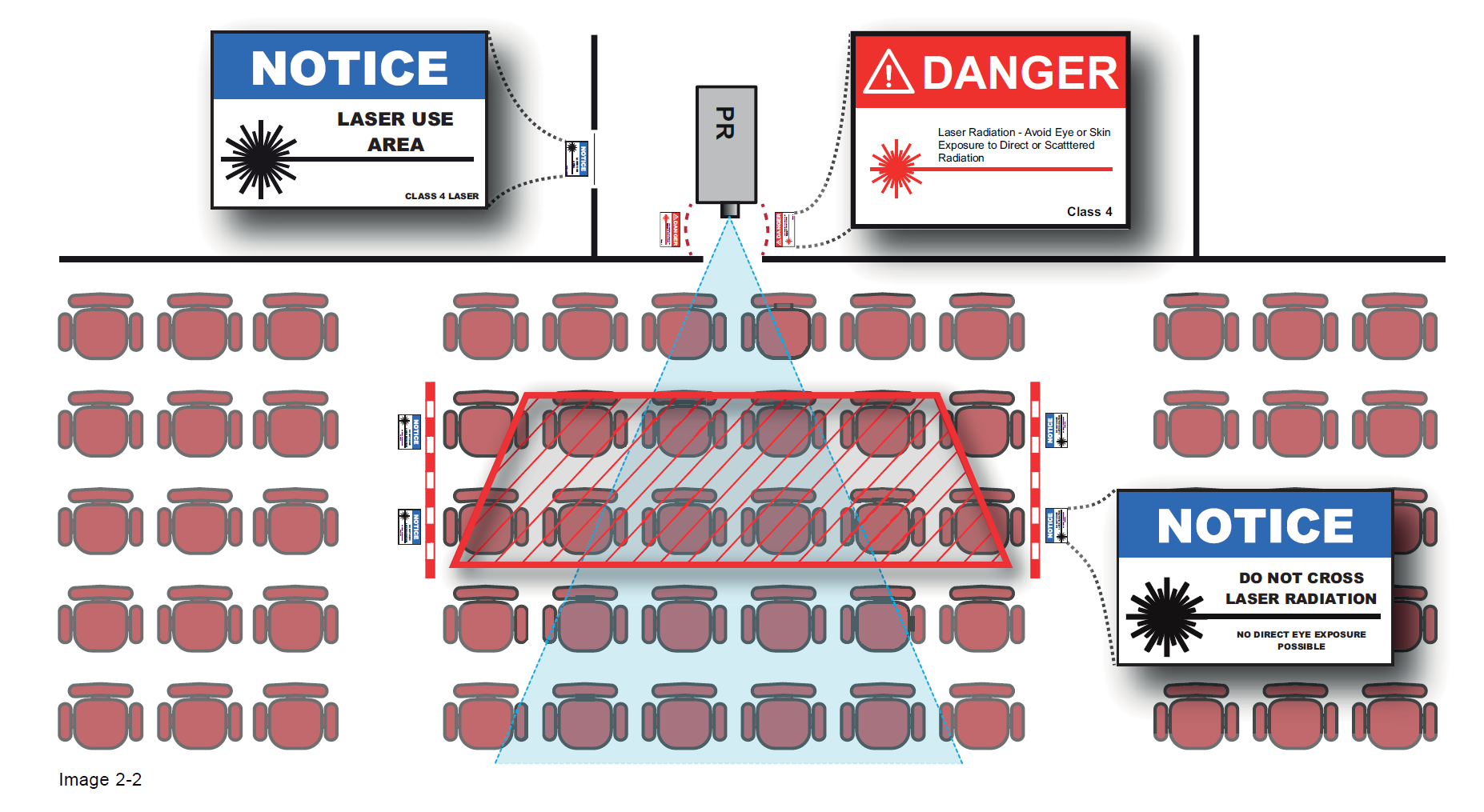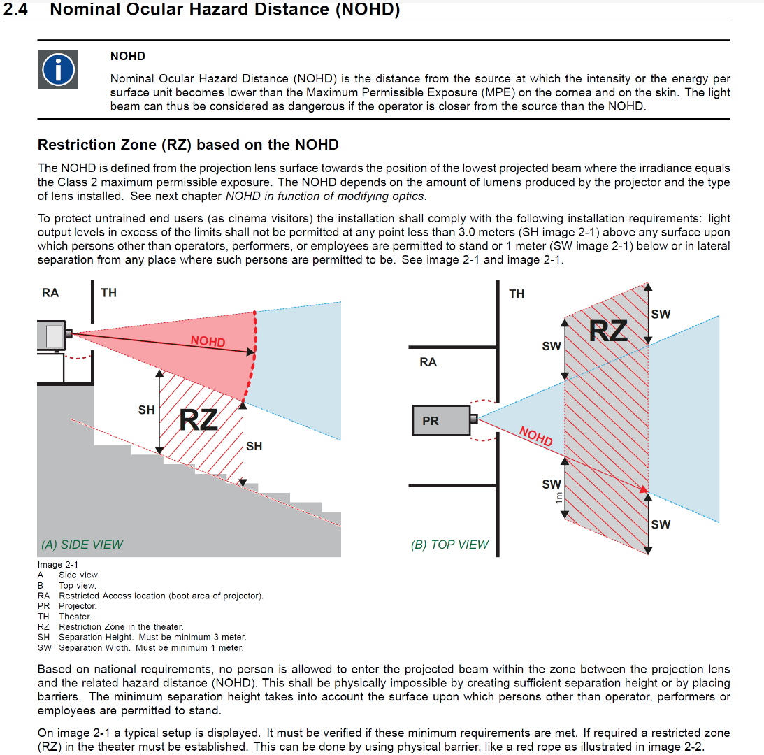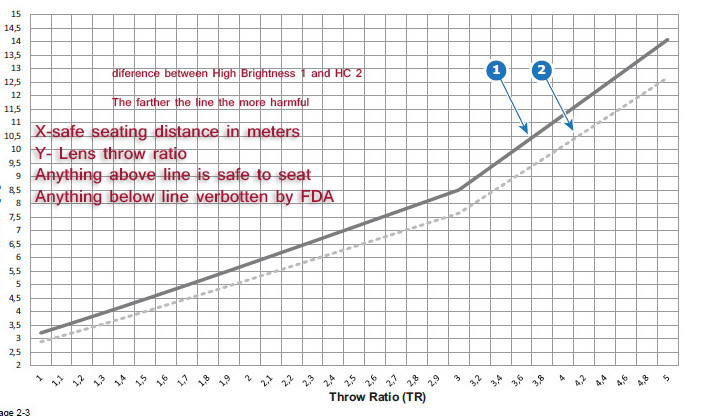 Projectors that are now rated class 4 will become class 3 over 15,000 lumens, a higher contrast projector with low lumens is actually more Dangerous, wide angle short throw lenses are the best solution to reduce potential hazard, the narrower the image beam the more intense.
