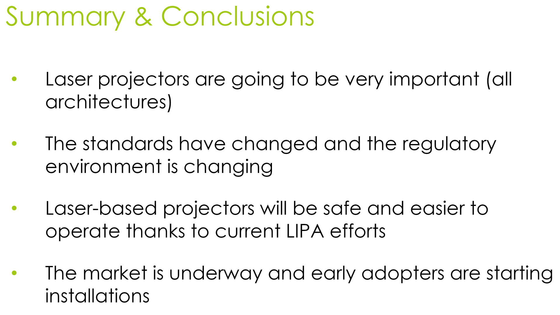 How did we get to this point? According to Greg Niven, who represented the Laser Illuminated Projector Association (LIPA) in a presentation given at SID in early June, the organization has had success in Europe (IEC) and Japan on regulations regarding laser and laser-phosphor projectors, but it has not been as successful in the US. Niven explained that the organization's efforts have been focused on convincing regulatory agencies that a laser projector - whether powered by RGB lasers or a laser-phosphor engine - should be treated like lamp-based projectors, not a laser light show device or laser welding solutions. That may seem obvious, but it has taken tremendous effort and research to prove this.