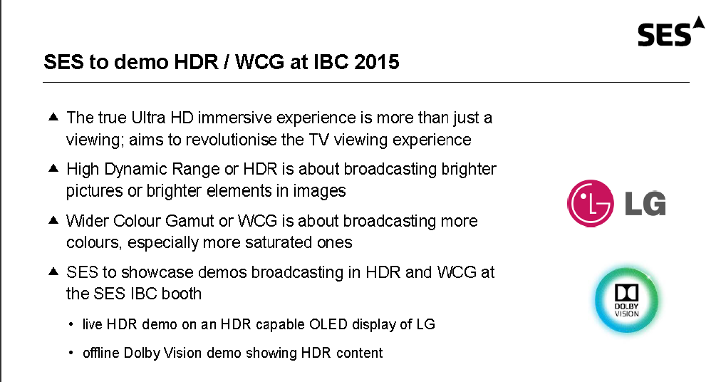 SES will have a meeting room with a Dolby Vision demo and another with an SMPTE 2084 EOTF curve based system running on LG Displays.