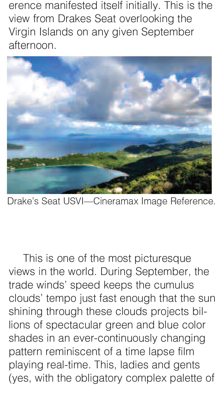 So I asked him, do you want to know what the reference HDR Image has been all my life since age 17 growing up in the caribbean? "There is an island called St Thomas, on top of that I island there is a place called Drakes Seat that looks east, you go there on a September and the winds and clouds create a coreography of 14 bit color with rec 2020 and 10,000 nits hdr.