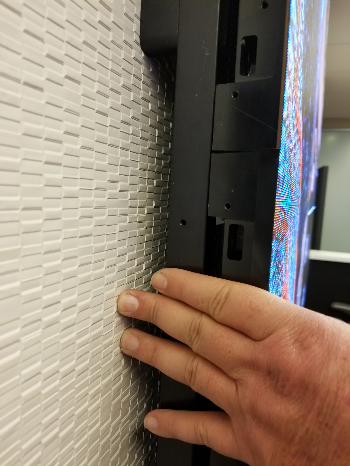 As for the white area module edges, I don't remmeber these being noticably worse, bujt perhaps if I review the pictures I took. In going to black/darker area's I could see the tiles, besides the modules. When signal is off it is super obvious the surface area in at least one demo unit was not smooth/even.