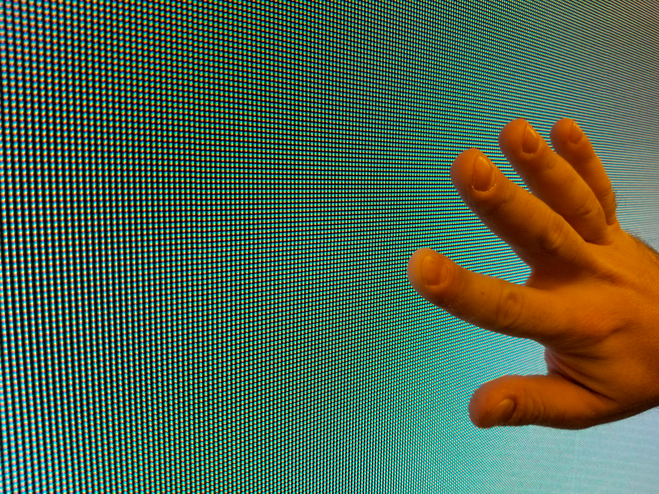 In white areas near full brightness I can see at 0,5 times the picture wide also the gabs between the panels that likely disappear when you are 1 times the picture wide in distance.