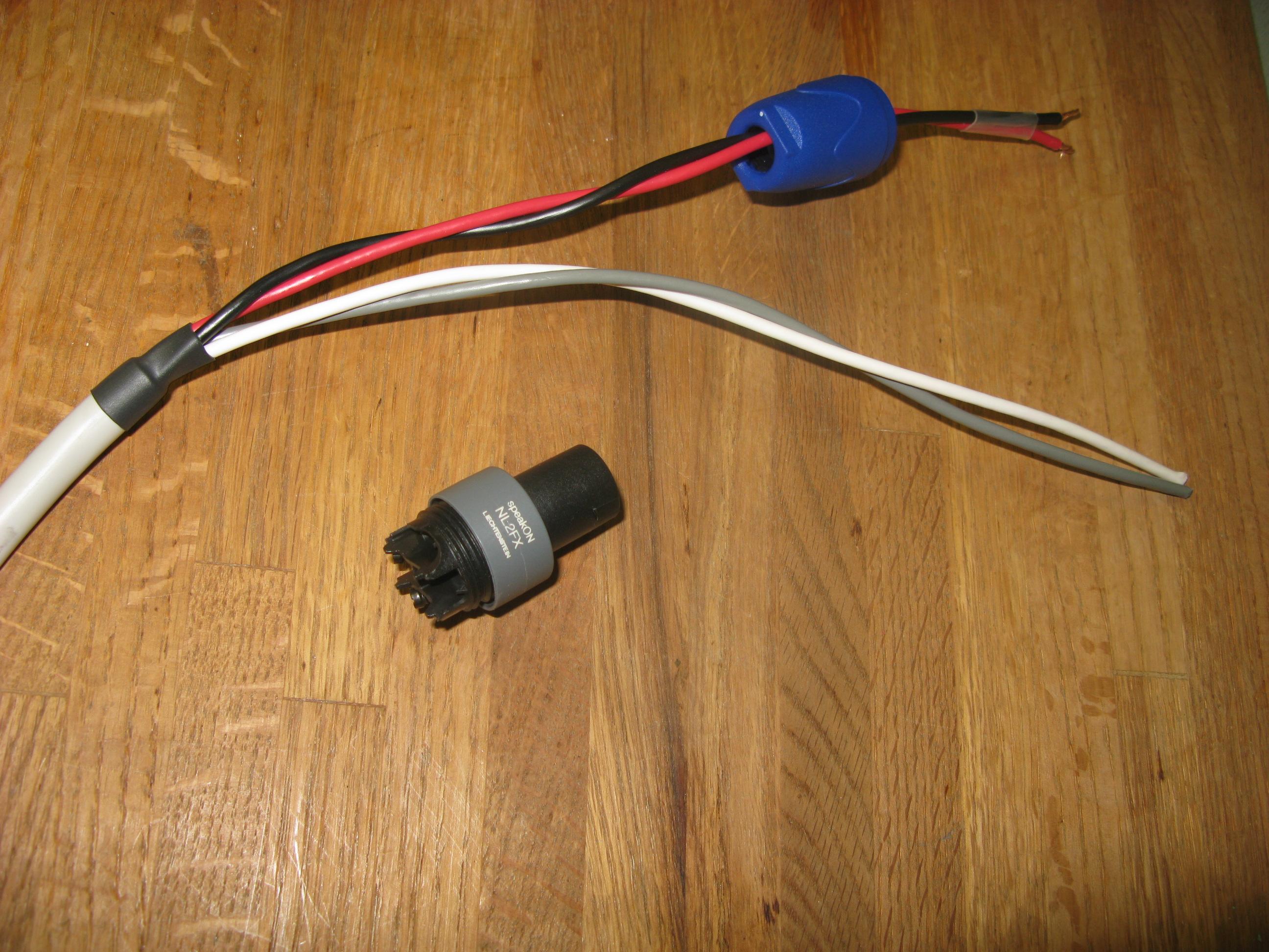 NL4FCThe NL4FC – jacket is stripped back 1.5” and insulation offconductors .5” – leaving 1” of jacket inside the plugBe sure to use red and white to pos:  black and gray to negAs you tighten the back of the plug – it will snug onto the inch of cable jacket