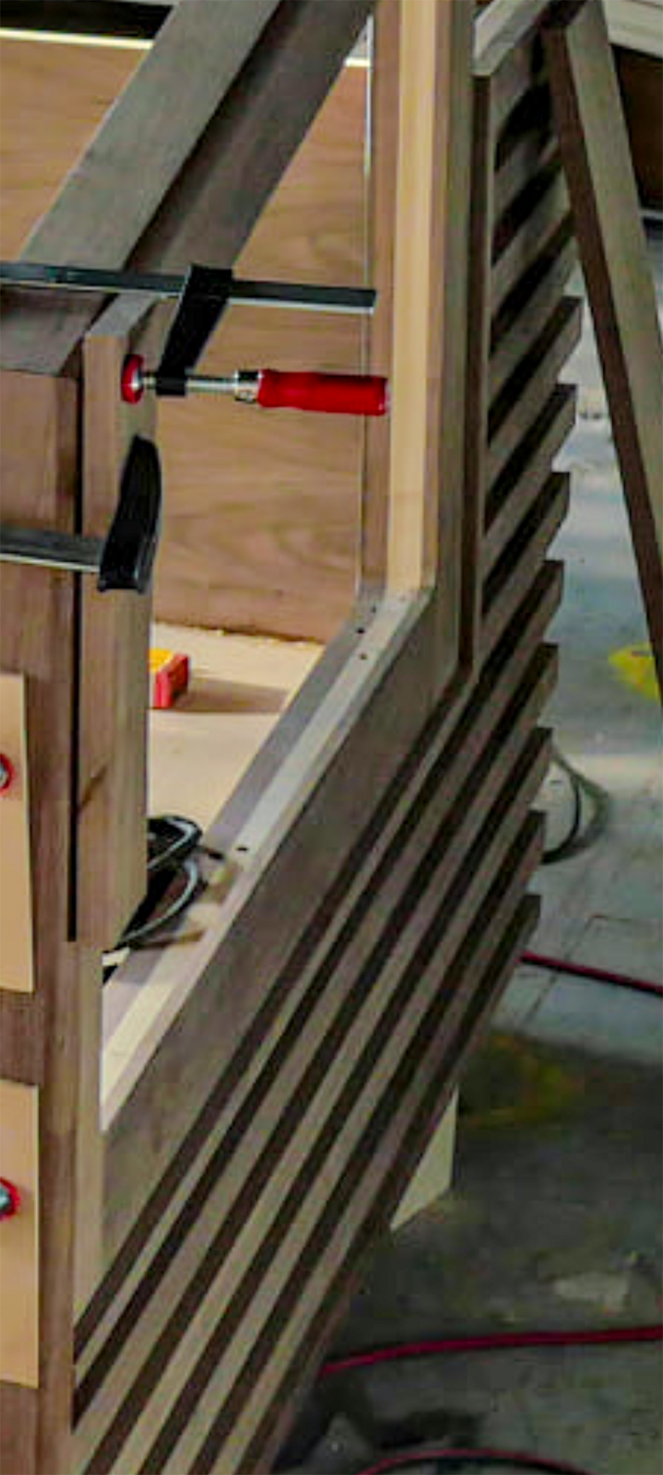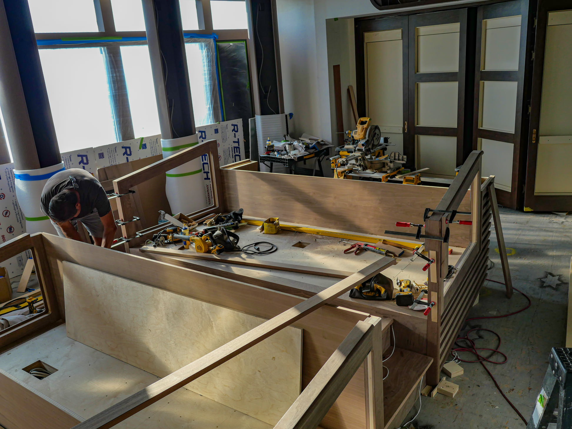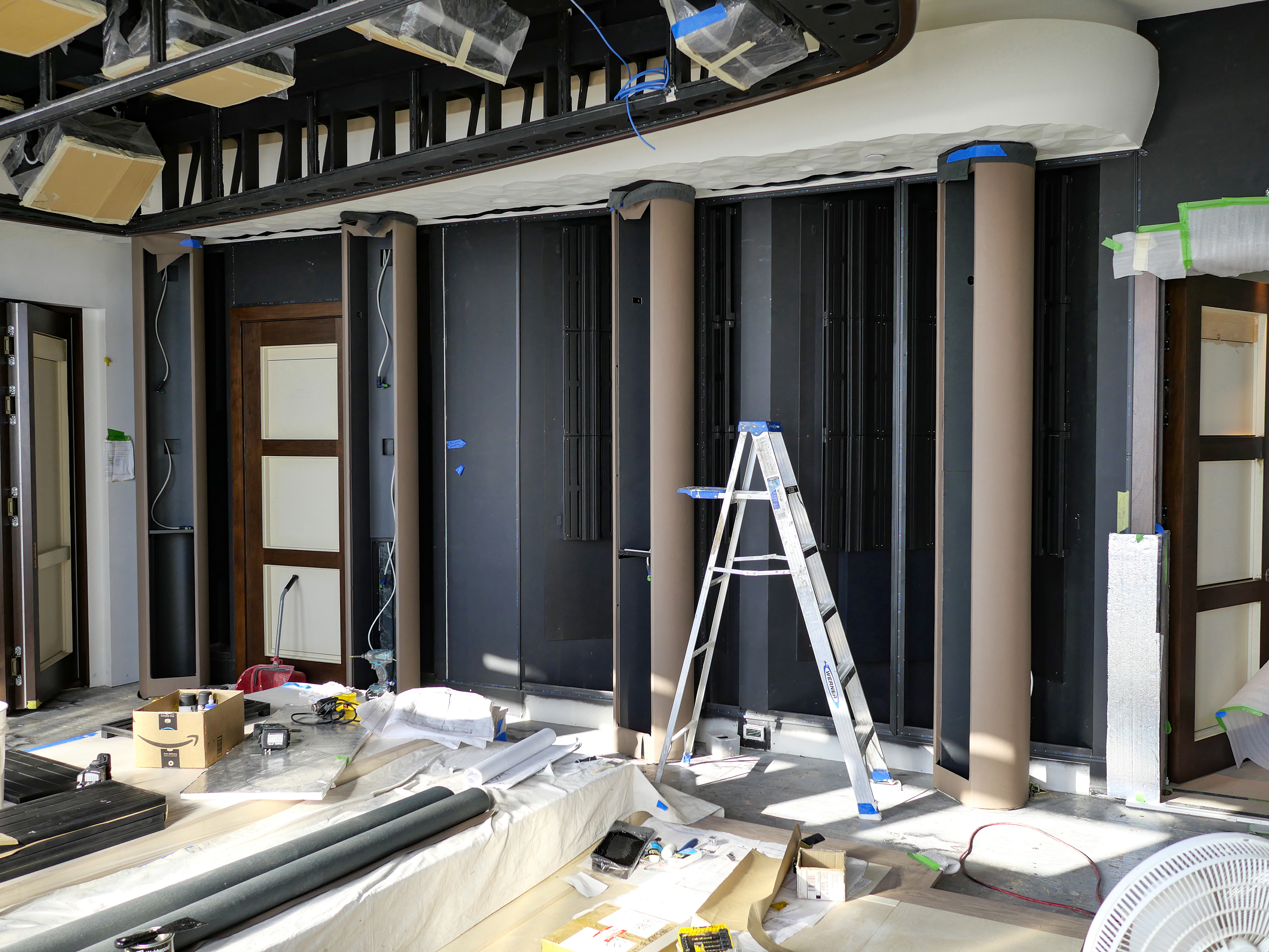 In the meantime The 7 circular diffuser-speaker columns are ready to be delivered on Monday and because the parquet flooring comes in from the sides to meet the column plywood support, the columns will be installed and populated with all speakers, so that should be fun.