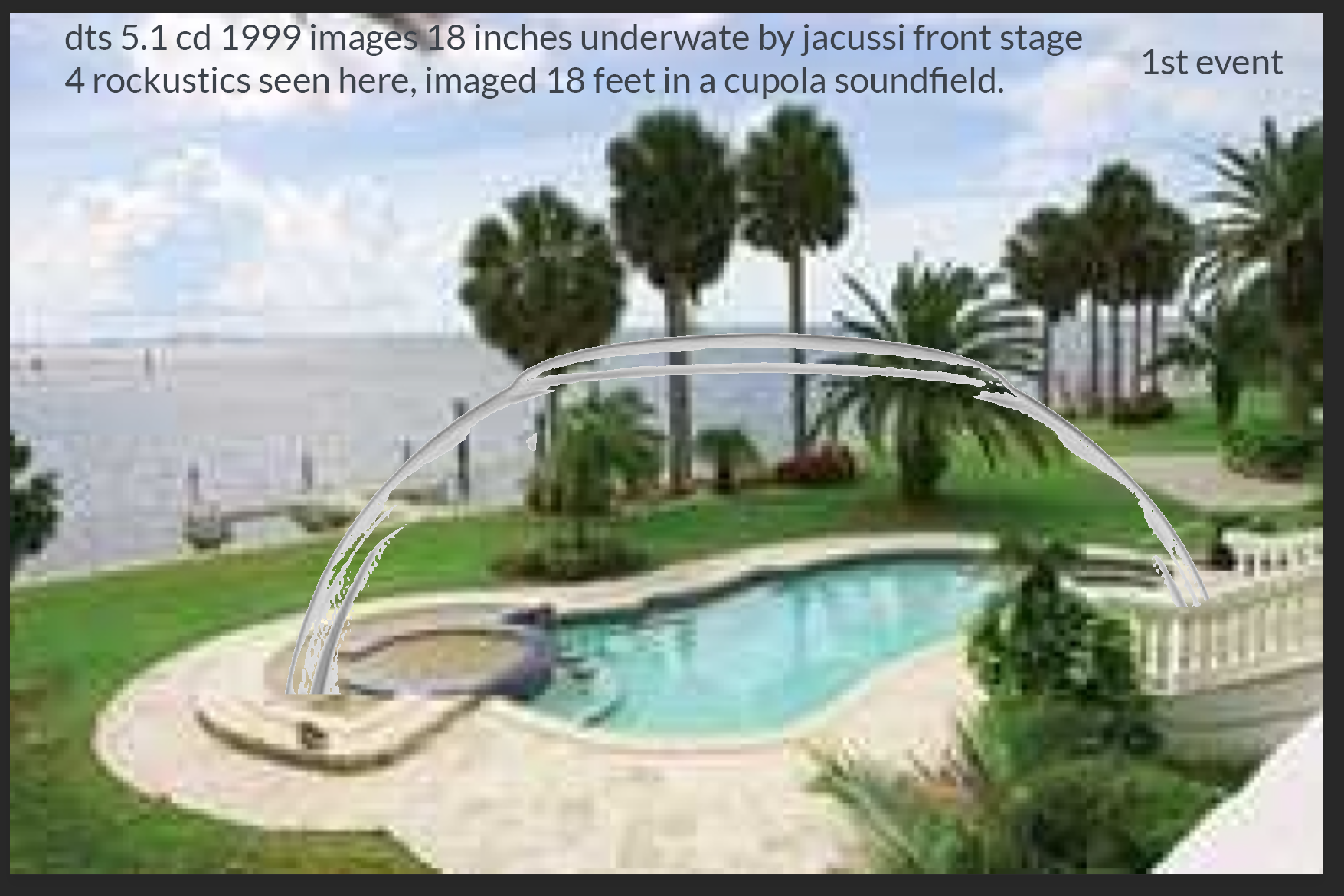 What was an accidental discovery of very intriguing "sound-field epicureanism" was the pool. We had installed 4 Rockustics around the pool we were expecting a single layer sound image. In reality because of the way the DTS Music images, the sounds appeared to come from a cupola of sound that extended 18 inches underwater by the Jacuzzi, and soared up to an invisible bubble, palpably 16 to 18 feet up into the air.