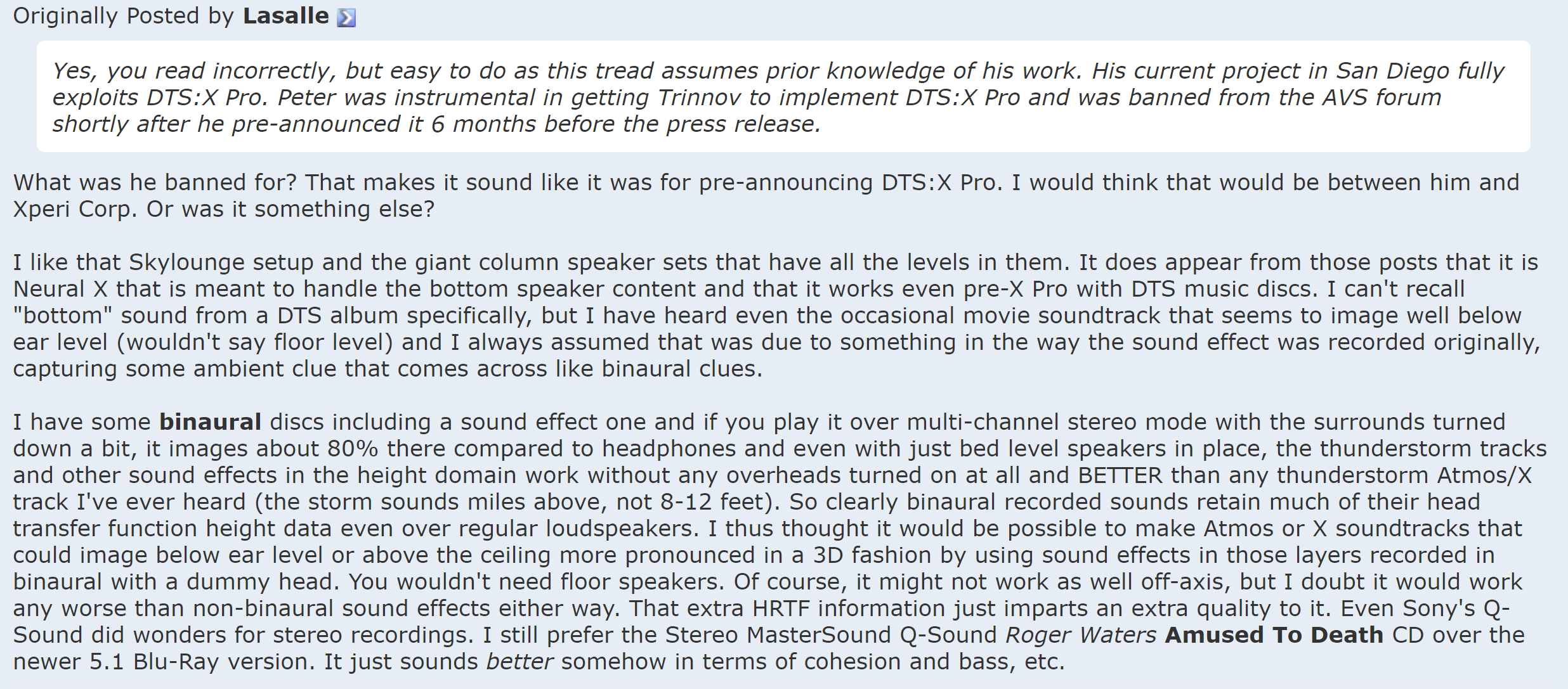 As I told The President of DTS during the persuasion campaign, after I gave as background the 10 degree below water and cupola pool imaging anecdote, i pumped dts' rich 5.1 heritage etc. "I really did not want it for DTS-X Pro but for the full channel count Neural-x". Neural X is not an original DTS IP, it was on the market, evaluated by THX but DTS bought it. The combination of the dts music imaging extended physically by many individual speakers using my favorite upmixer is what I want to perfect. I also explined some Kaleidescape Studios do not release the advanced codecs, a perfect situation for NEURAL-X PRO.