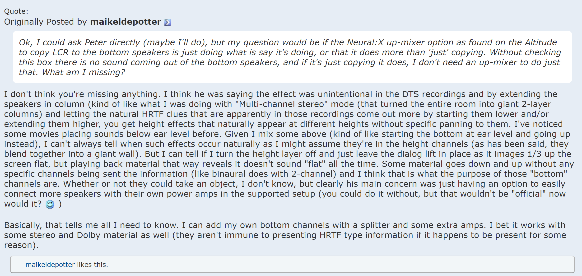 I prefer a tweaked neural-X over auro 3D, the laterit sounds ok at Brads but i prefer the cupola. Here is me at Brad's reacting to Auro 3D, i exaggerate lol.